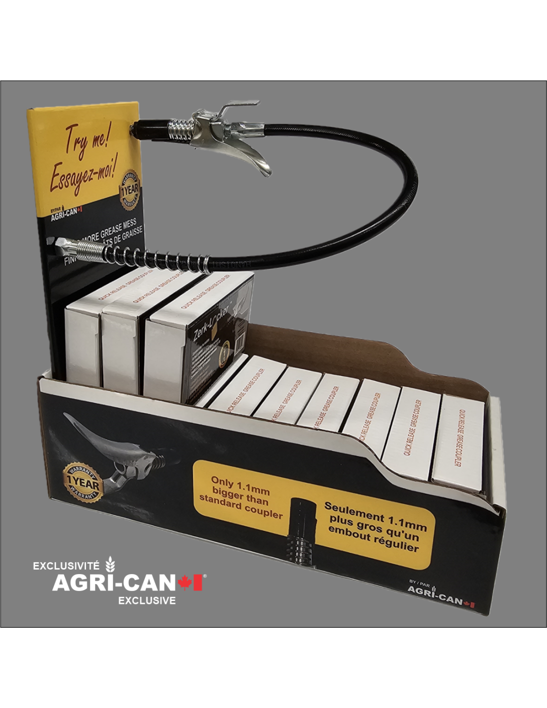Présentoir de caisse de qualité professionnelle pour les embouts graisseur Zerk-Locker® d’Agri-Can.