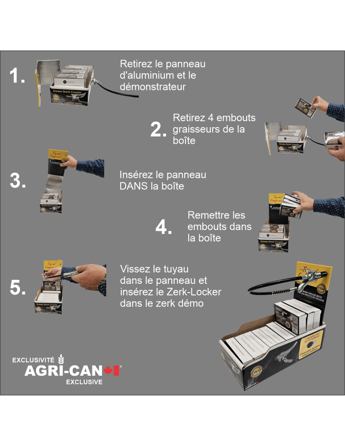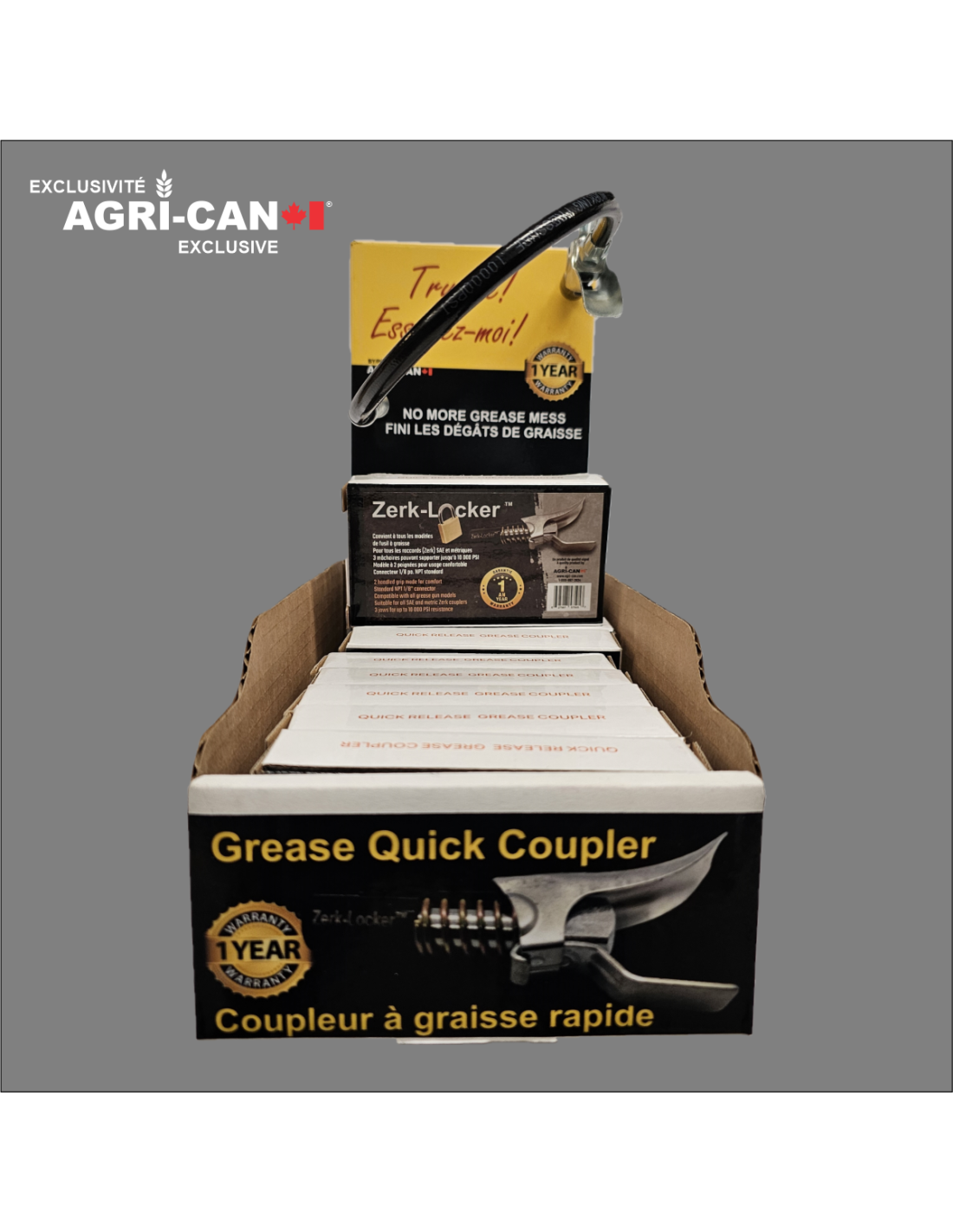 Présentoir de caisse de qualité professionnelle contenant 12 embouts graisseurs Zerk-Locker® d’Agri-Can.