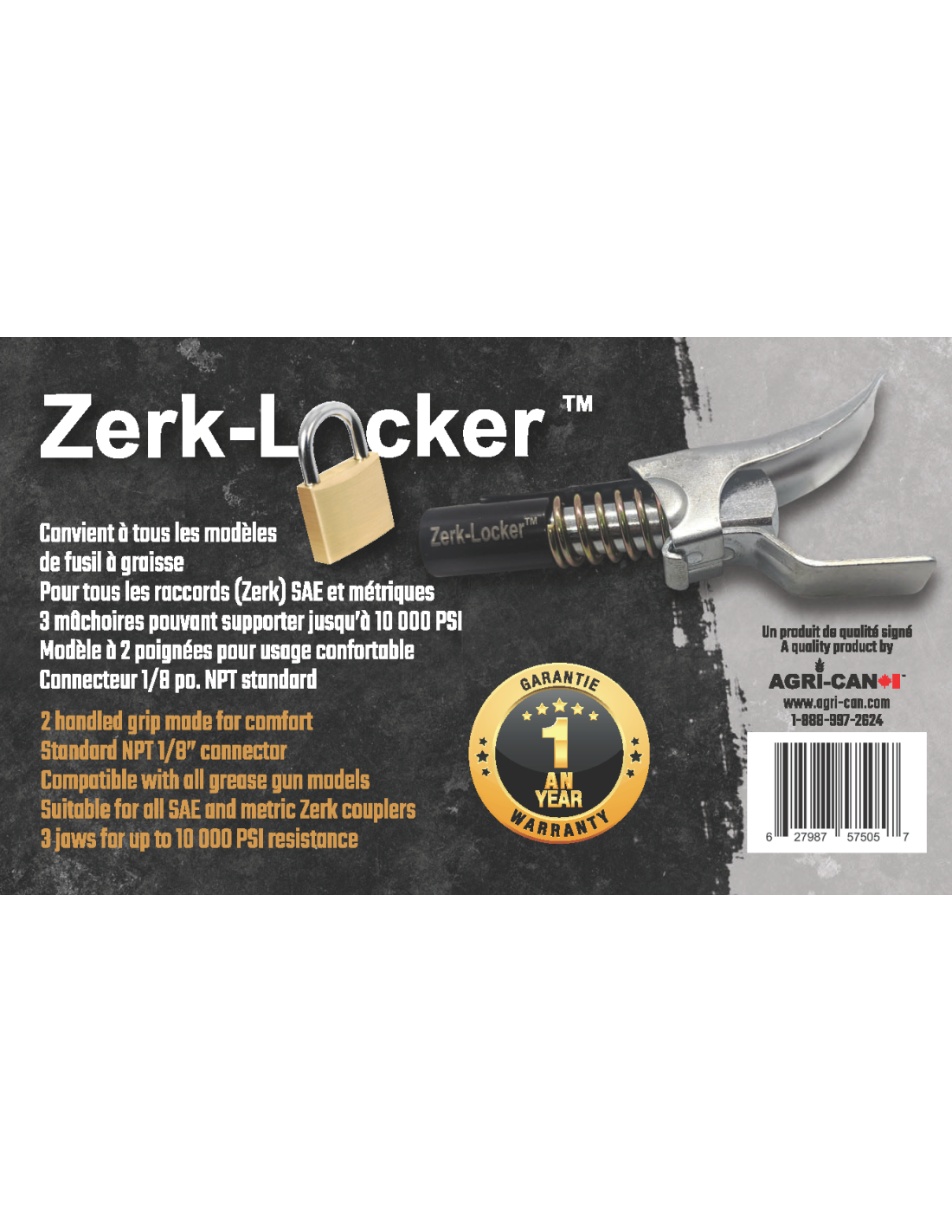 - Comprend un boyau de graissage de 18’’ ainsi qu’un embout graisseur Zerk-Locker®